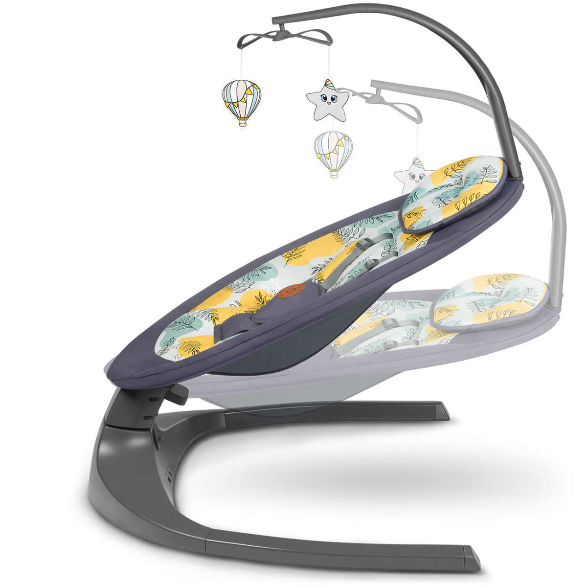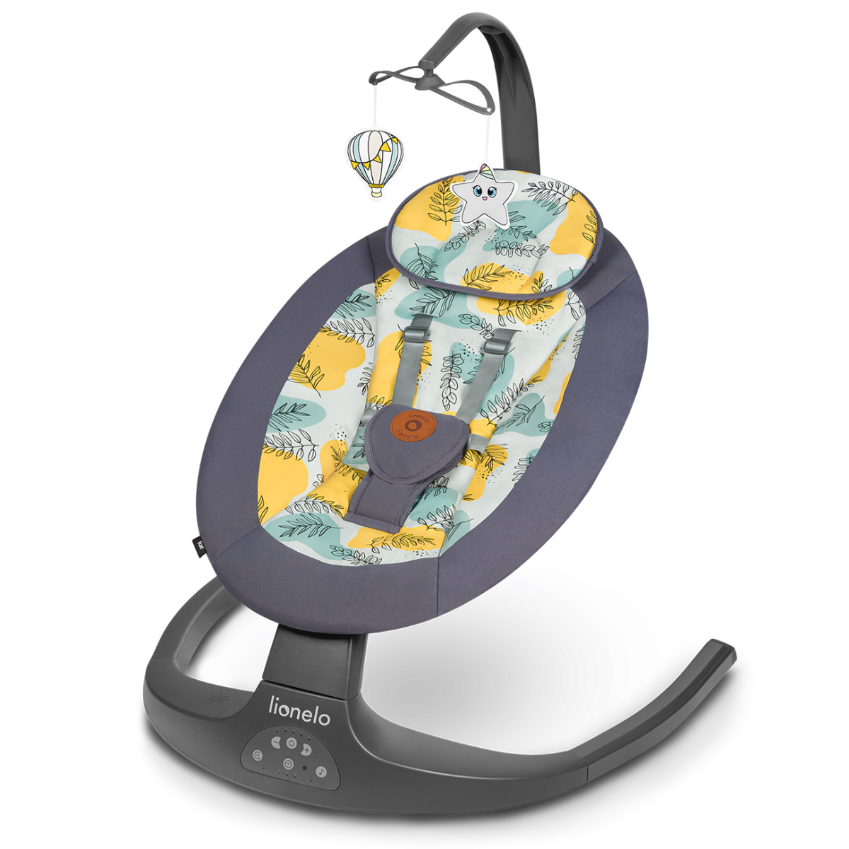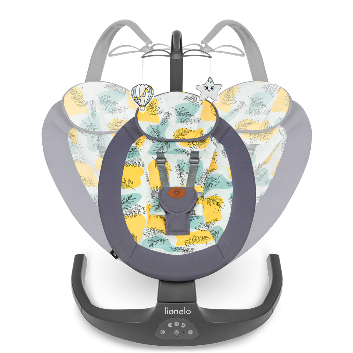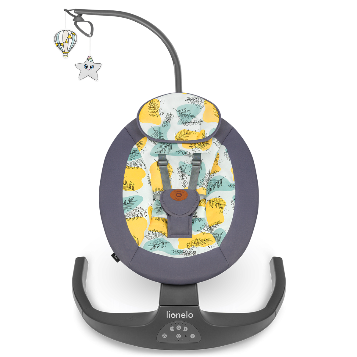 Το Lionelo Ralf έχει τη δυνατότητα να αιωρείται με πέντε διαφορετικά επίπεδα ταχύτητας. Η κίνηση λικνίσματος είναι πλάγια: δεξιά-αριστερά . Ο ενσωματωμένος χρονοδιακόπτης σάς επιτρέπει να επιλέξετε έναν από τους τρεις χρόνους παλινδρόμησης – 8, 15 ή 30 λεπτά.