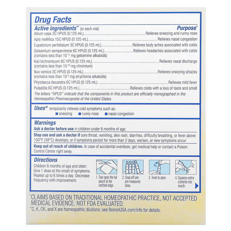 Boiron, coldcalm, ανακούφιση από το κρύο, 6 μηνών και άνω, 30 εφάπαξ από του στόματος υγρές δόσεις, 0,034 fl oz το καθένα